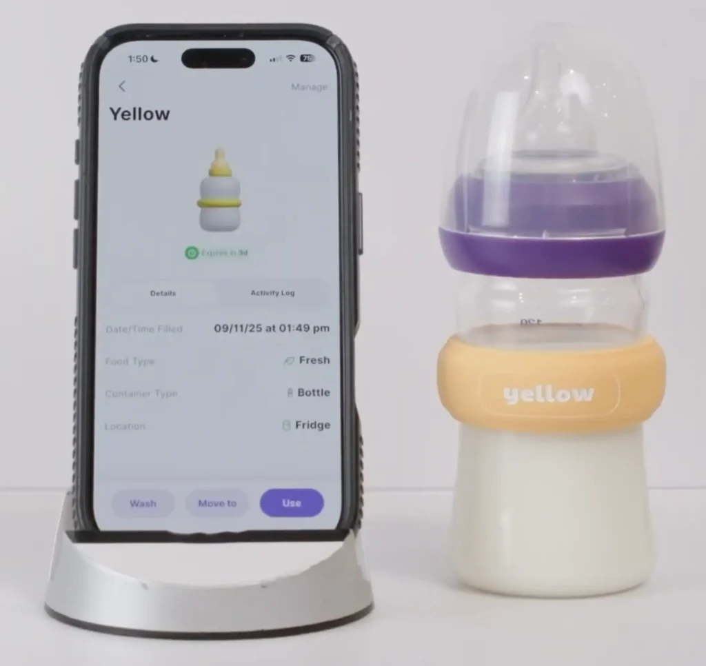 Her flagship product, the HoopDee Hoops, is a simple silicone band with NFC technology that syncs to a mobile app. Together, they help caregivers track freshness, manage inventory, and eliminate the stress of asking, “Is this bottle still safe to feed?”